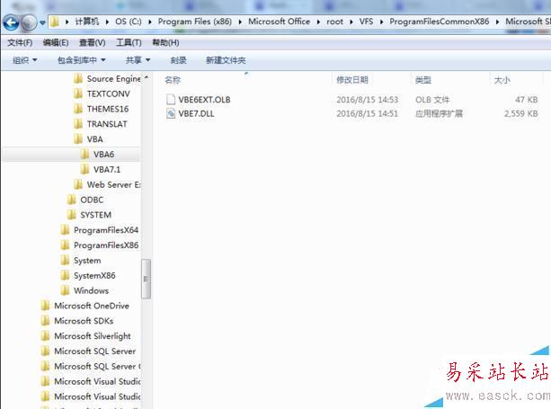 4、打開VBA文件夾,將VBA6文件夾里的VBE6EXT.OLB復制到VBA7.1文件夾中