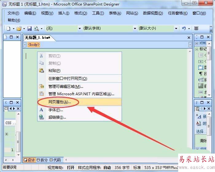 2、軟件窗口的編輯區(qū)右擊,選擇網(wǎng)頁屬性選項。