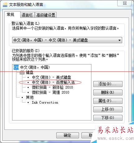 3、在彈出的窗口中,通過“上移”“下移”調整輸入法順序,將你習慣的輸入法提前。比如我用的百度輸入法,提前了。一般調整到第二位即可。以保持默認的輸入狀態。