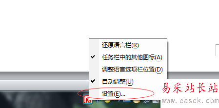 2、微軟拼音輸入法安裝后,會將自己的輸入法順序提前,導致用鍵盤切換默認輸入法時,總是先切換到微軟拼音輸入法,先把這個輸入法順序調整一下。在輸入法圖標上鼠標右鍵,菜單中選擇“設置”。