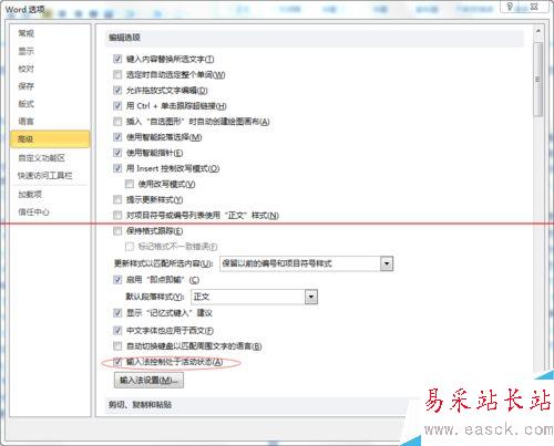 5、在選項窗口中,切換到“高級”,找到圖中紅色圓圈所示的選項(輸入法控制處于活動狀態)設置,去掉勾選。確定。