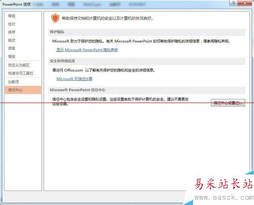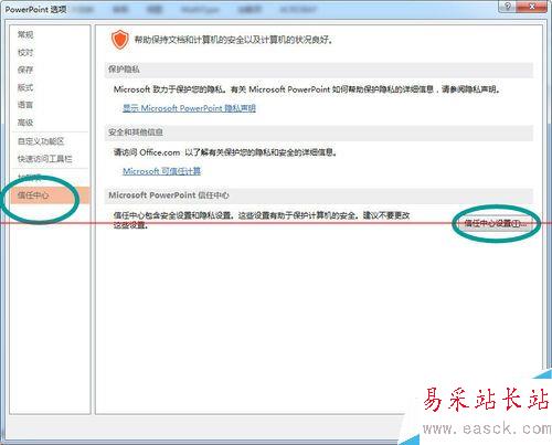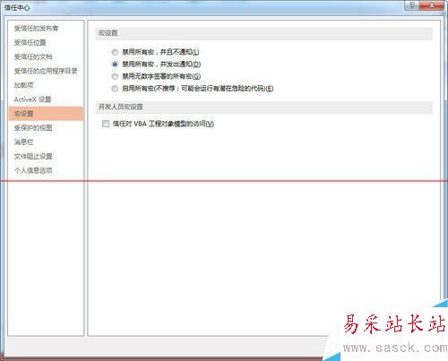 4、點(diǎn)擊信任中心,點(diǎn)擊信任中心設(shè)置,彈出信任中心設(shè)置界面