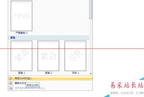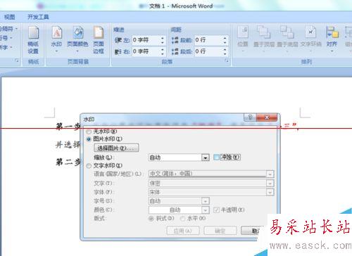 6、在頁面布局界面下選擇添加水印——自定義水印——選擇圖片,按路徑找到保存好的圖片。把“沖蝕”前的小勾去掉。“縮放”選擇為“自動”