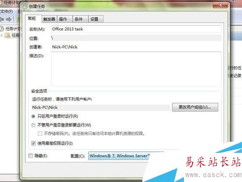 常規欄名稱填為:“Office 2013 task”,勾選“使用最高權限運行”,配置右邊下拉菜單選 擇“Windows 7”;