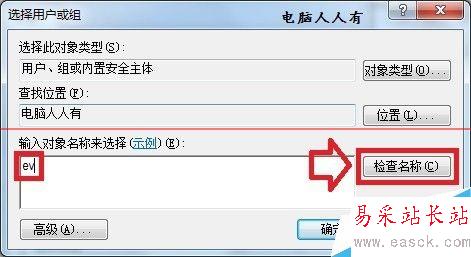 5、然后在 輸入名稱對象選擇 中輸入ev▶再點擊檢查名稱。