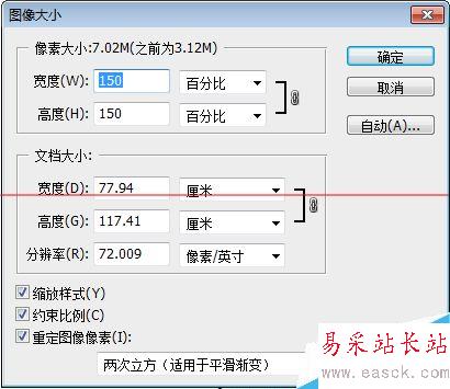 2、用photoshop打開需要所得到的圖片。看一下尺寸,如果寬度小于1400則需要放大,點擊“圖像”->“圖像大小”,如圖設置,再點擊確定。這里最好按照150、200這樣的整倍數來放大,否則會有鋸齒問題。放大之前特可以先調整百分比來預覽一下。