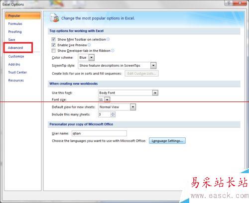3、點擊右下角選框中的excel options,中文大概是“excel選項”或者相應的word選項等。