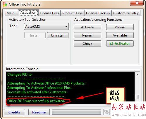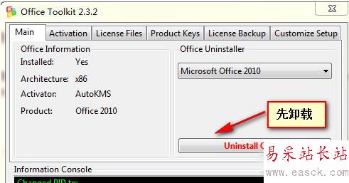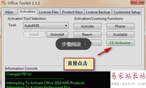 在激活office時,如果出現Cannot use EZ-Activator because your licensing details are corrupt錯誤。打開Office Toolkit工具