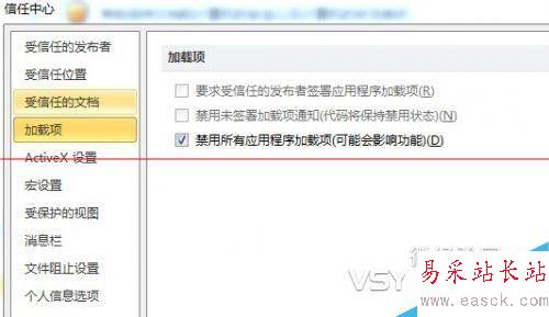 3、在“加載項”里選最后一個“禁用所有應用程序加載項”;