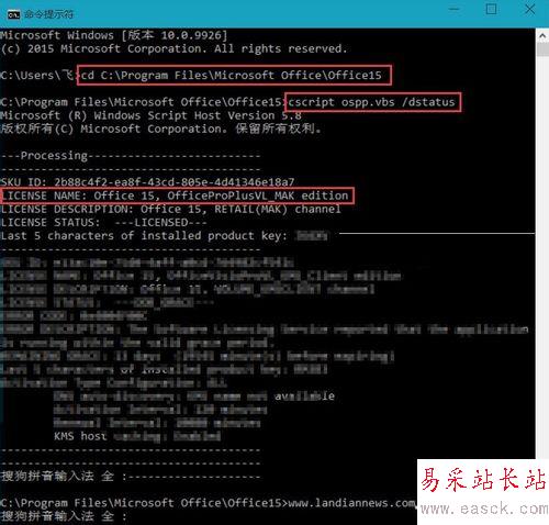 2、打開命令提示符,用cd 命令行進(jìn)入Office 2013的目錄,以上述目錄為例,輸入:cd C:/Program Files/Microsoft Office/Office15 回車,繼續(xù)輸入:cscript ospp.vbs /dstatus 回車