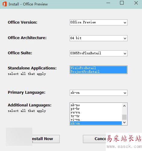 ▲ 選擇合適的版本和語言,第一項選Office Preview;然后根據自己系統情況選擇安裝32位或者64位版(32位系統只能安裝32位版,64位系統都可以,但推薦安裝64位版);下面Office Suite選0365ProPlusRetail或者0365HomePremRetail都適合普通用戶,企業用戶可以選另外的選項;至于Standalone Applications,如果你有這方面需要,可一并選擇,普通用戶可不選;下面主要語言和附加語言根據個人需要選擇就好,中國用戶可選擇zh-cn中文。選好之后點擊“Install Now”開始安裝。