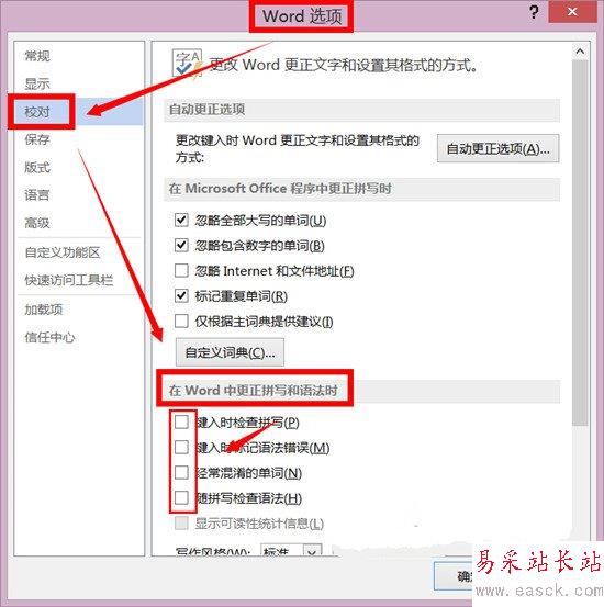 3.打開Word選項后點擊左側的“校對”選項,然后不要勾選“鍵入時檢查拼寫”“鍵入時標記語法錯誤”等四項。