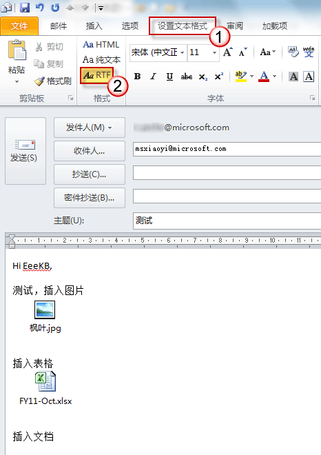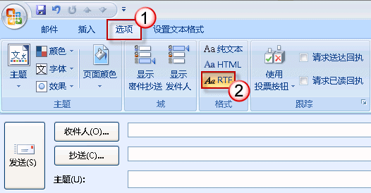 以 Outlook 2010 為例,新建一份郵件,切換到設置文本格式選項卡。在格式欄選中 RTF 格式。