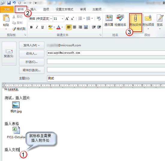 設置完成后,將鼠標移動到郵件正文需要插入附件的地方,單擊“郵件-插入附件”即可.