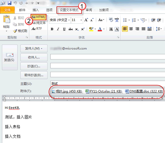 其實在郵件正文中插入附件是可以實現的,但需要將郵件格式由默認的 HTML 格式轉變為 RTF 格式。