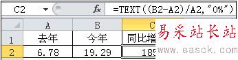 我們套用同比增長率計算公式,在excel中稍變通,就得到公式=TEXT((B2-A2)/A2,"0%"),就計算出了同比增長率。