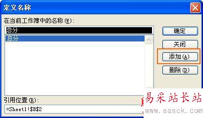 這時顯示【定義名稱】對話框,在【在當前工作簿中的名稱】框里輸入名字,點擊【添加】按鈕,然后單擊【確定】按鈕,這時就對剛才選中的單元格重新命名為“總分”了。