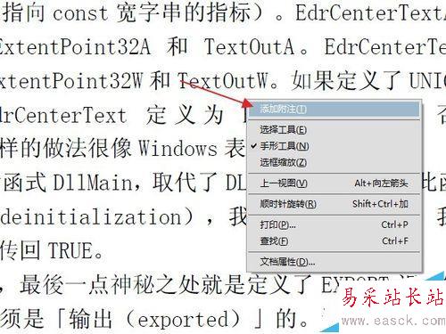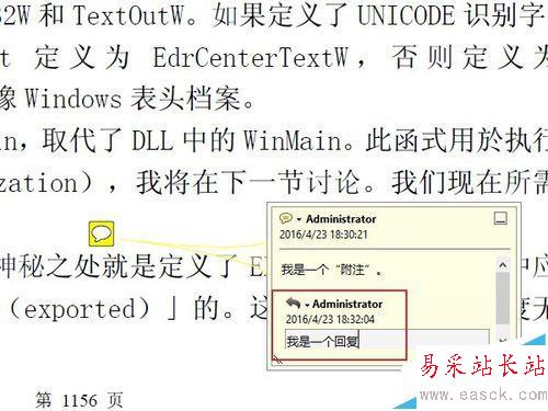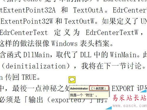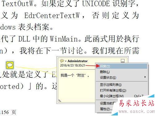 8、實際上,附注的基本功能到此已經夠用了。但是有的時候,我們更需要一些比較小眾化,或者個性化的需求,下面簡要的說幾個。比如這個文檔添加一個附注后,需要其他不同的用戶閱讀時,對這條附注里的問題做出回答,或者寫下體會,特殊要求,等等。那么可以用到“回復”功能。鼠標右鍵點擊附注,然后選擇“回復”。