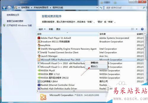 3、鼠標右擊名稱為【Microsoft Office Professional Plus 2010】項目,單擊【更改】命令