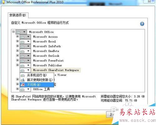 5、選中【Microsoft Sharepoint Workspace】,單擊旁邊向下的三角箭頭按鈕,選擇【不可用】命令
