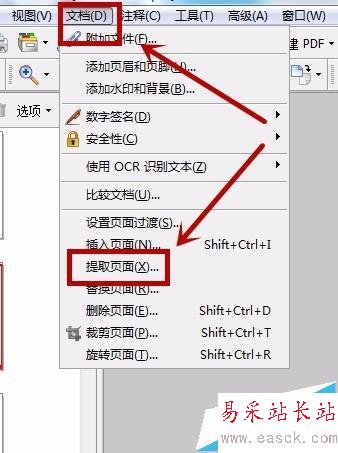 4、為了提取頁面,我們點擊菜單欄里的文檔選項,再選擇提取頁面。
