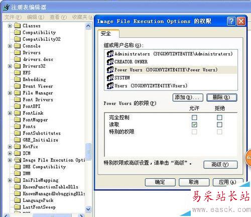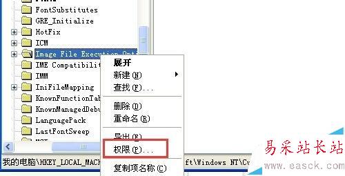 4、右鍵點(diǎn)擊Image File Execution Options,在選中菜單中點(diǎn)擊“權(quán)限”選項(xiàng),跳轉(zhuǎn)到權(quán)限維護(hù)菜單