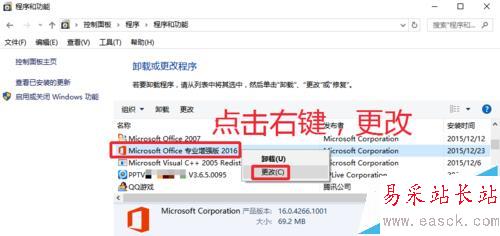 3、在OFFICE2016軟件上,點(diǎn)擊鼠標(biāo)右鍵,出現(xiàn)的界面中,點(diǎn)擊更改,如圖!