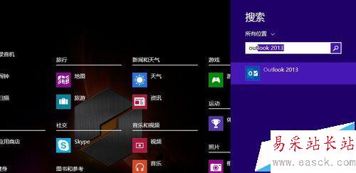 4、在win8.1應(yīng)用桌面,輸入outlook,搜索顯示outlook軟件,點(diǎn)擊outlook,即可打開軟件