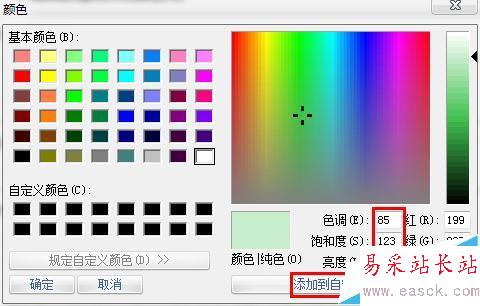 5、這樣就打開了下圖所示的對話框。按照如圖所示,設置【色調(diào)】為85,【飽和度】為123,亮度為【205】;這就是我們需要的蘋果綠色,然后單擊【添加到自定義顏色】。
