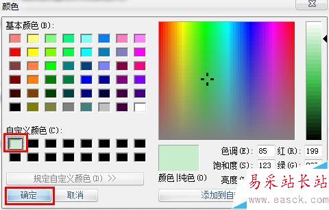 7、這樣就可以看到對話框中的背景顏色顯示我們剛改變了的果綠色。單擊對話框下方的【確定】。