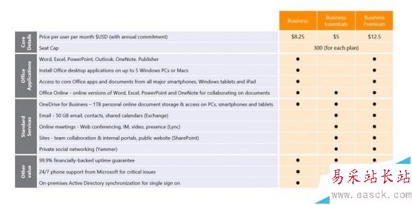 二、Office 365 Business:價格:8.25美元/用戶/月(保底1年);