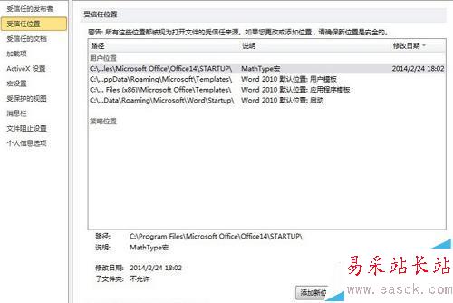 1、要確保路徑被office信任。依次打開word->文件->選項->信任中心->信任中心設置->添加新位置,添加C:/Program Files/Microsoft Office/Office14/STARTUP。