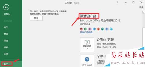 2、這里點擊左側的賬戶選項,然后右邊可以看到激活的信息。激活的產品,說明我們的Office2016軟件現在是激活的狀態,否則這里不會顯示這個信息。