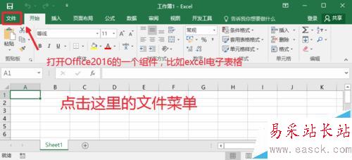 1、首先打開Office2016的一個組件,這里打開excel電子表格軟件,點文件菜單。