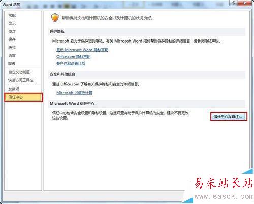 4、在選項對話框中選擇“信任中心”,點擊“信任中心設置”,如圖: