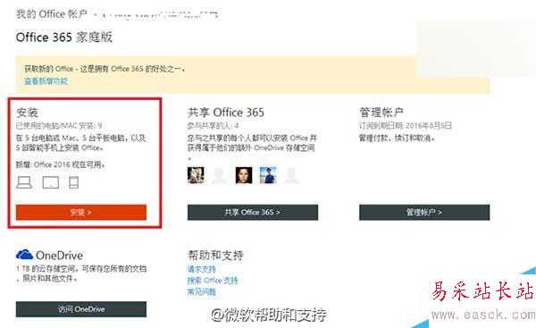 • 如果你今后打算升級Office 2016,到時可登錄到Office 365的“我的Office賬戶”頁面,點擊“安裝”。