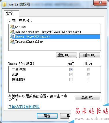 8、將你自己的用戶權(quán)限設(shè)置為完全控制,即在完全控制右邊的允許下面的方框打上勾。完成后點(diǎn)擊應(yīng)用,再點(diǎn)擊確定。