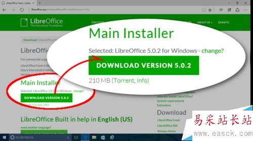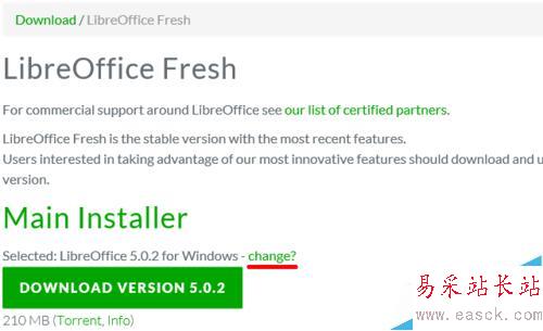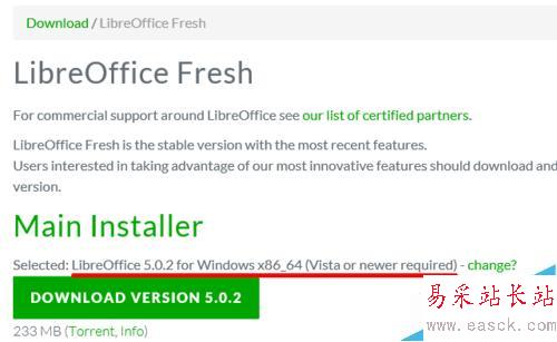 6、比如,我們的電腦安裝了 64 位的 Win10,而且我們想下載最新版的 LibreOffice,我們就可以點(diǎn)選圖中下劃紅線的選項(xiàng),即 Windows x86_64(Vista or newer required,和 5.02。