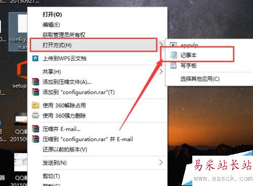 6、接下來,打開桌面中的configuration.xml文件,然后對著該文件擊右鍵,在彈出的菜單中,點(diǎn)擊選擇“使用記事本程序”打開該文件。