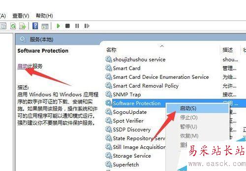 3、從打開的“服務”窗口中:針對Win10系統,找到“Software Protection”服務項并右擊選擇“啟動”項以啟動此服務。