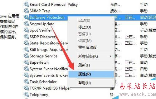 5、此外,為了防止以后再次發生此類“無法驗證此產品的許可證”的問題,我們需要執行以下操作:右擊“Software Protection”服務項,從其右鍵菜單中選擇“屬性”項。