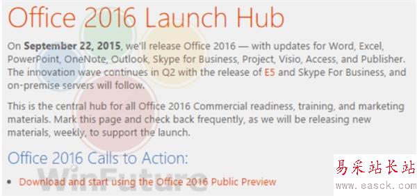 月25日消息,Win10已正式發(fā)布,想必大家現(xiàn)在都很關(guān)心微軟下一代辦公套件Office 2016的發(fā)布時(shí)間,根據(jù)國(guó)外網(wǎng)站W(wǎng)inFuture泄露的一份文檔截圖顯示,微軟計(jì)劃在2015年9月22日正式發(fā)布Office 2016。