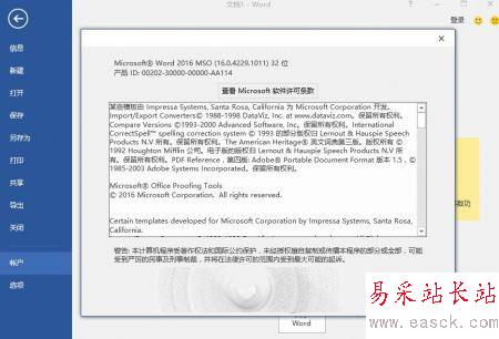 點擊查看微軟軟件許可條款,Office 2016 v16.0.4229.1011已標記為:O16_RTM_OSUB.1_RTM_CN,隸屬于RTM渠道。