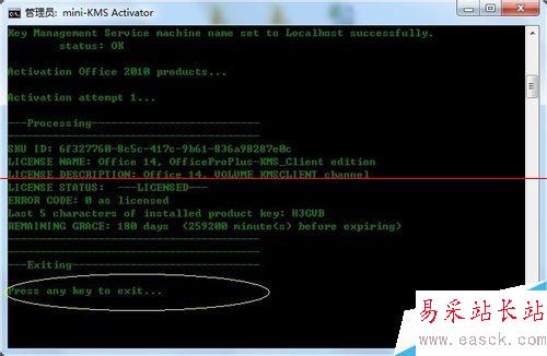 第三步,選擇框框第二個:Activate Office 2010VL,運行Activate,進行激活。在命令提示符里面提示的:elect option [1-3]:后面輸入1就可以了。等到出現Press any key to exit...就可以全部關掉了。