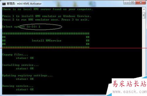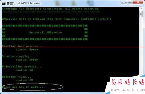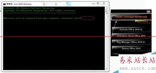 打開激活軟件之后會 出現一個框框。點擊第一個:Install/Unimstall KMService,打開之后出現下圖1所示。這個步驟是要安裝“KMService”。在命令提示符里面輸入“y”即可,等到出現Press any key to exit...就可以關掉命令提示符了,注意右邊的框框不需要關掉。