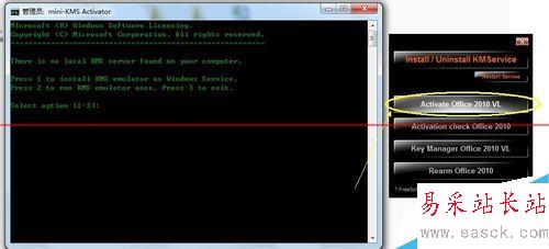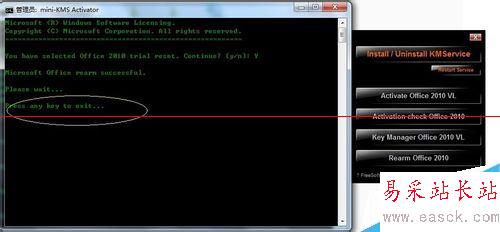 第二步,選擇框框里面的最后一個Rearm Office 2010,該步驟的意思是要重置“Rearm”,接下來的步驟同第一步:在命令提示符里面輸入“y”即可,等到出現Press any key to exit...就可以關掉命令提示符了,也要注意,右邊的框框還不需要關掉。