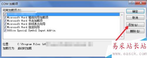 6、如果COM加載項(xiàng)列表中沒有我們安裝的插件加載項(xiàng),那么我們點(diǎn)擊“添加”按鈕,手動(dòng)添加一下。