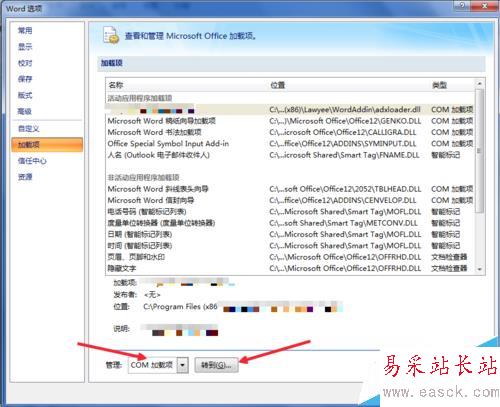 4、然后在管理處選擇“COM加載項(xiàng)”,點(diǎn)擊“轉(zhuǎn)到”按鈕。