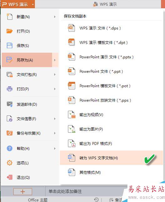 如果需要將PPT演示變為DOC文檔,可在WPS演示軟件中打開PPT文件,選擇WPS演示菜單的“另存為”→“轉為WPS文字文檔”即可。注意,WPS文檔類型要預設值為DOC。