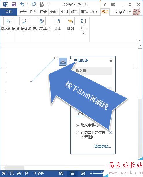 從“插入”→“形狀”畫直線時,按下Shift再劃線,可畫出水平、垂直或15、30、45、60、75、90度的直線。